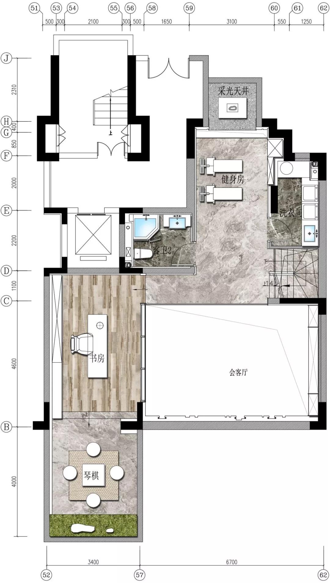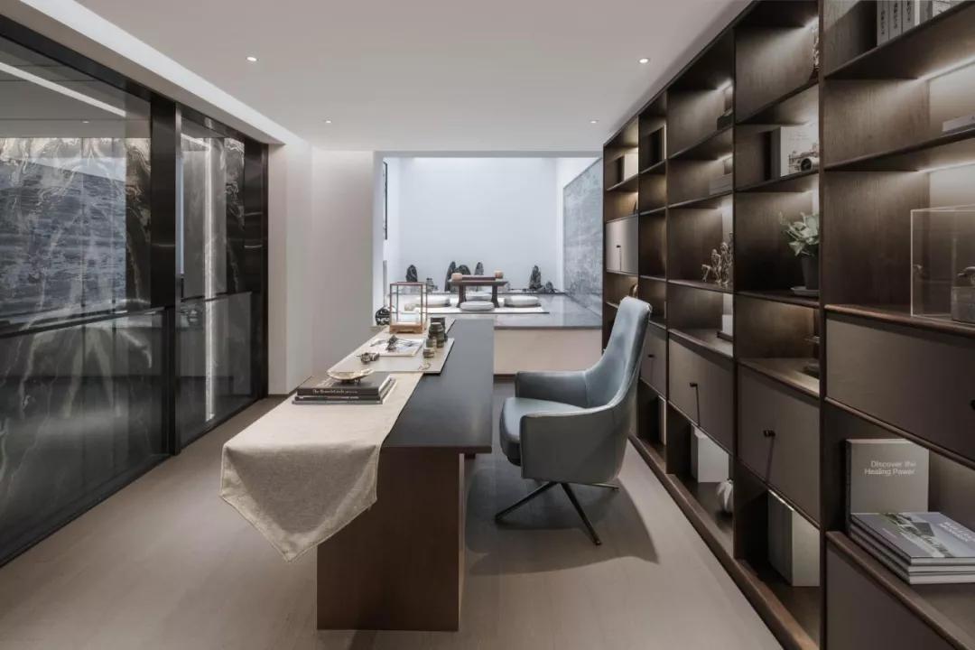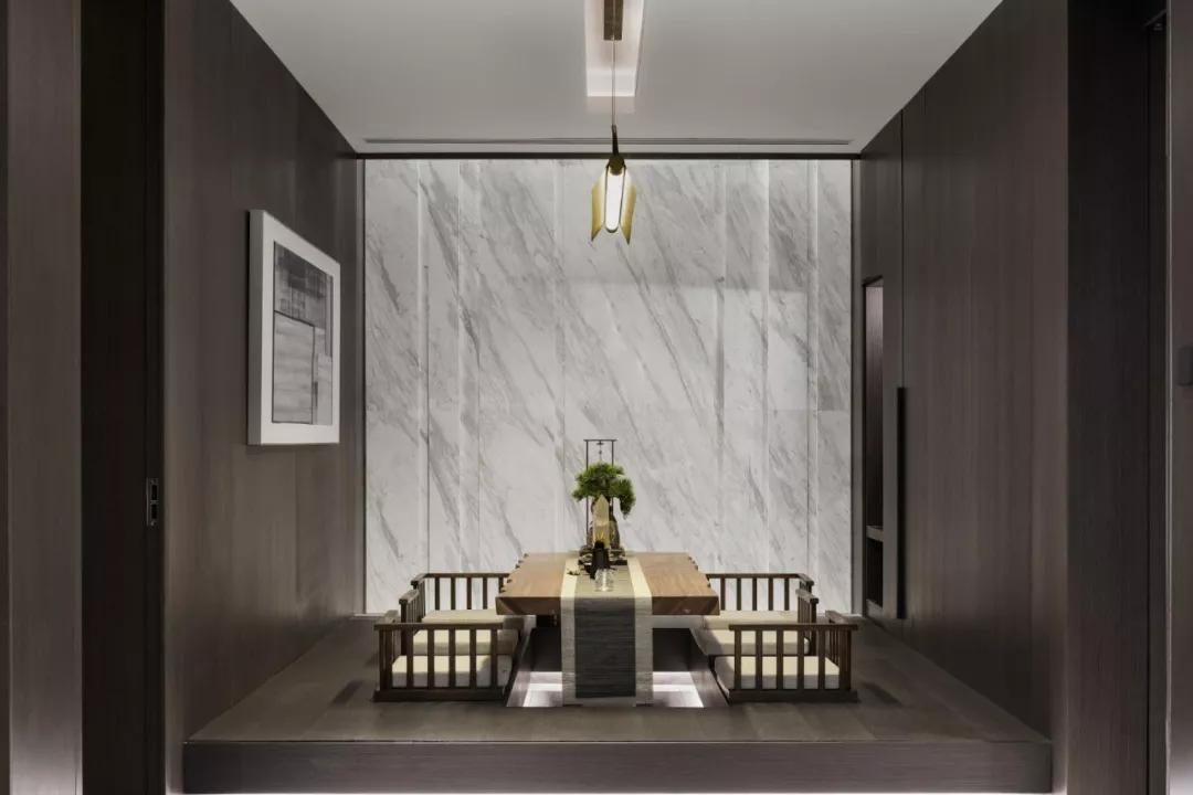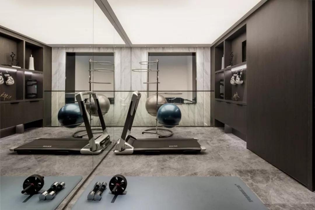 負一層圍繞中空區域展開,書房、棋牌室與健身房各得其所,麻豆视频在线视频延續“院”的概念把“景”影射其間,當兩束光從不同斜度進入,灑向山水造景牆麵上,“居室內而知四時”之感油然而生。